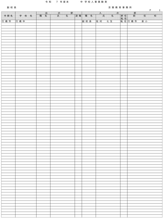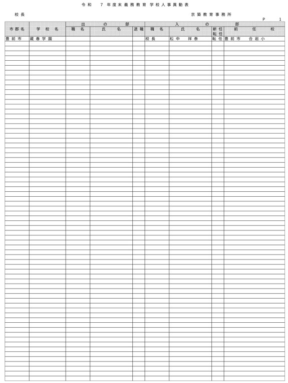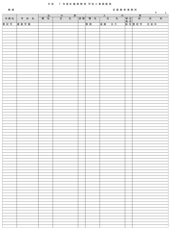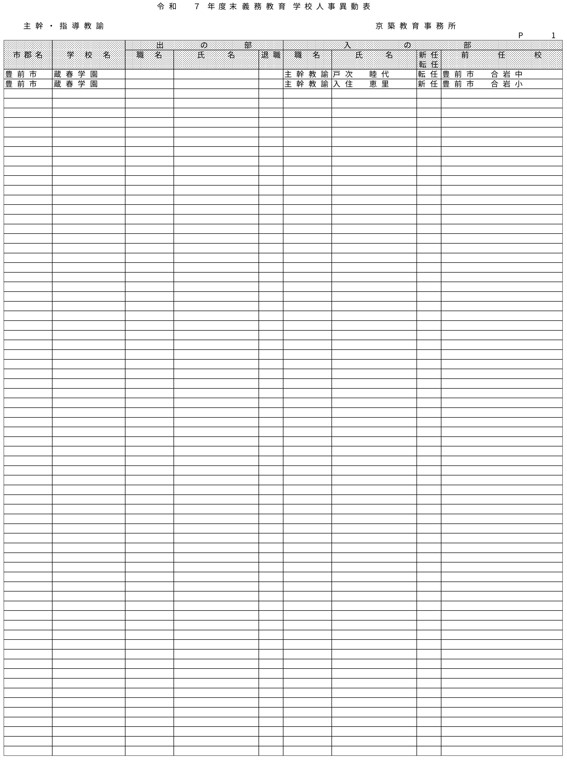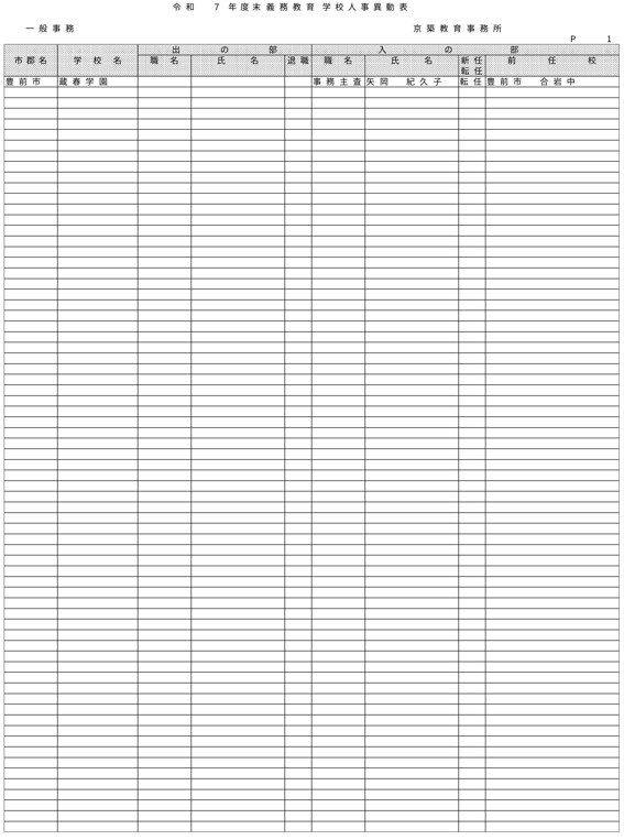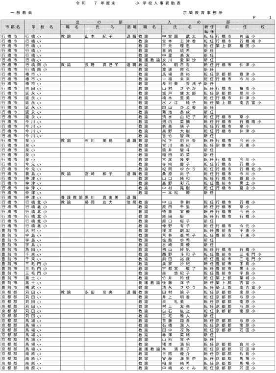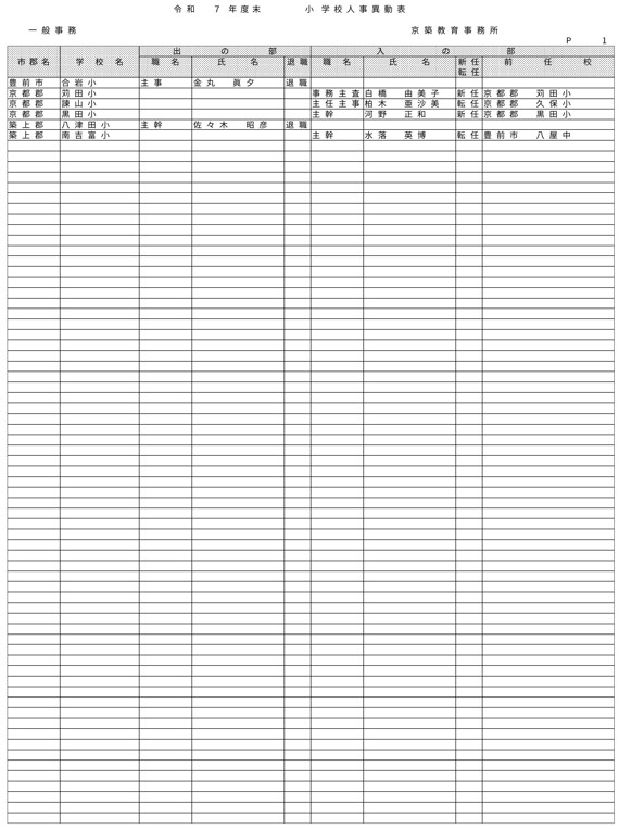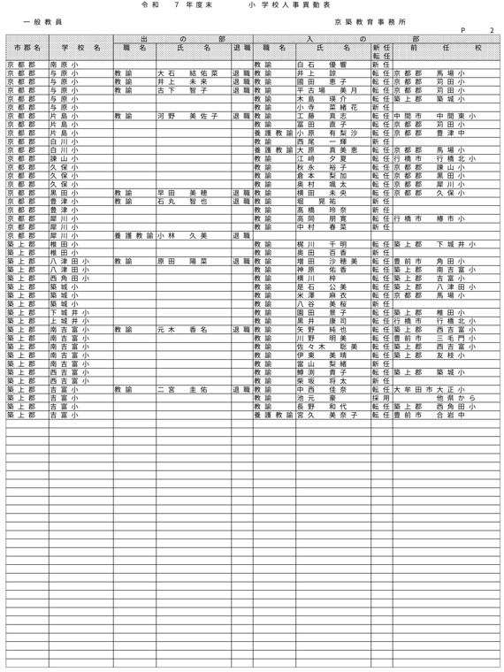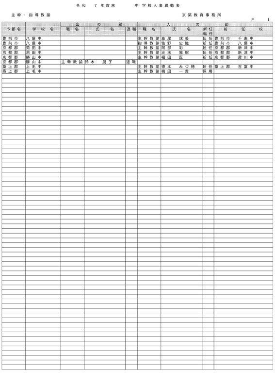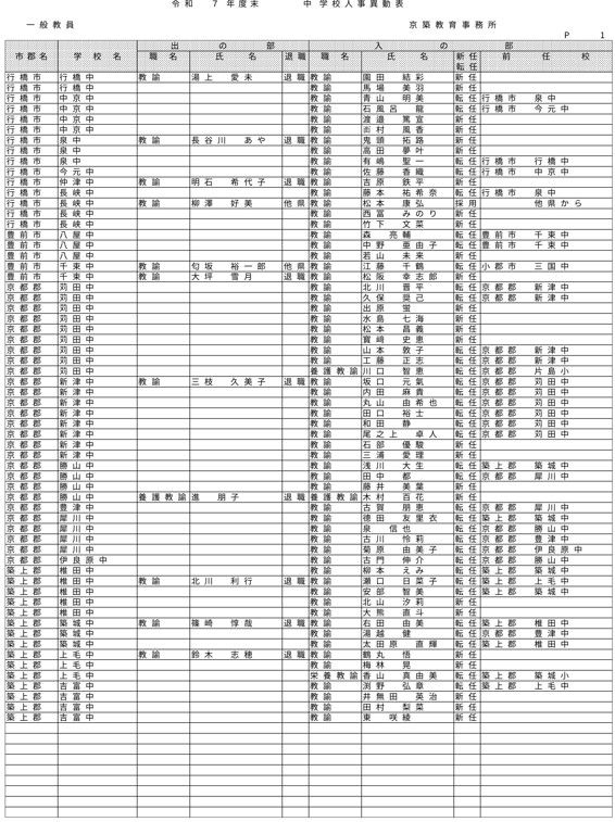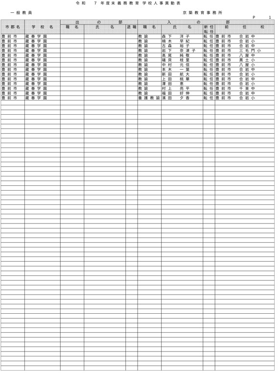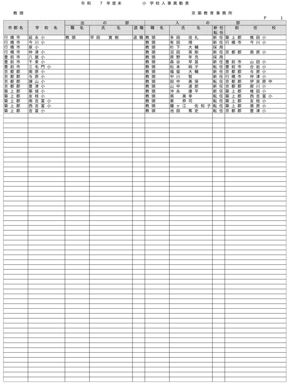 HOME 【全掲載】福岡県教職員の人事異動(6)あの先生はどの学校に?(京築教育事務所/小・中・義務教育学校) 【全掲載】福岡県教職員の人事異動(6)あの先生はどの学校に?(京築教育事務所/小・中・義務教育学校) 政治・行政 23時間前 福岡県教育委員会は県立学校や政令市を除く市町村立学校などに勤務する教職員の人事異動を発表した。異動の規模は市町村立学校が3833人、県立学校等(県立中学校と県立中等教育学校含む)が1292人、県教委事務局が71人の計5196人で、前年度より955人減っている。詳細は以下の通り(一部を除き、画像ファイルにて掲載)。 衆院選 実録TNC報道部 事件 気象・災害 ホークス アクセスランキング ACCESS RANKING アクセスランキング一覧へ あなたにおすすめ 最新 BREAKING NEWS 30分前 「3年間で5件目指す」北九州市がデータセンターの誘致強化 市独自の優遇措置で固定資産税など免除 武内市長が表明 福岡 40分前 「福岡城さくらまつり」4月8日まで開催延長 去年より1日早い開花もまだ満開発表ならず「見ごろをより長く楽しんで」 福岡市の舞鶴公園 2時間前 30代女性がはしか感染 今年県内で2人目 全国的に2025年より早いペースで増加 不特定多数との接触について調べる 福岡 3時間前 きょう午後4時49分~ 「記者のチカラ」は… 11時間前 元交際相手の女性を襲いケガをさせた25歳の男 逃走先の福岡市内のホテルで発見し逮捕 最新一覧へ あなたにおすすめ あわせて読みたい記事 政治・行政 【全掲載】福岡県教職員の人事異動(7)あの先生はどの学校に?(県立学校教職員) 23時間前 政治・行政 【全掲載】福岡県教職員の人事異動(8)あの先生はどの学校に?(県立学校事務職員) 23時間前 政治・行政 【全掲載】福岡市教職員の人事異動(3)あの先生はどの学校に?(【入の部】中学校・特別支援学校) 2026/04/01 01:00 暮らし 4月から自転車の交通違反に「青切符」 福岡市・天神地下街で安全利用を呼びかけ 「危険で悪質な違反は検挙」 2026/03/31 16:00 事件・事故 住宅で「殺すぞ、金を出せ」 女性を拘束し現金数千円奪う 強盗事件として逃げた犯人の行方追う 福岡・久留米市 2026/03/31 15:30 気象・災害 深刻な水不足で対策を協議 取水制限強化も 筑後川水系6ダム貯水率12.3% 断水回避へ引き続き節水呼びかけ 福岡 2026/03/25 17:00 福岡でサクラが開花 平年より2日遅く去年より1日早い 気象台が発表 2026/03/24 15:33 福岡では13日昼前にかけて竜巻や突風、ひょう、強い雨のおそれ 大気の状態が非常に不安定に 気象台が注意呼びかけ 2026/03/13 06:10 福岡のサクラは去年より早く21日に開花、29日満開の予想 全国トップは19日の東京・名古屋など ウェザーニューズ発表 2026/03/11 14:30 気象・災害記事一覧へ 事件・事故 元交際相手の女性を襲いケガをさせた25歳の男 逃走先の福岡市内のホテルで発見し逮捕 11時間前 福岡県新宮町の海岸に若い女性の変死体 警察では事件と事故の両面から調べ 11時間前 レターパック1162枚「現金化」手助け疑い 元郵便局長の男ら2人を書類送検 詐欺グループが他人名義カードで1億円超分購入か 福岡 17時間前 覚せい剤“密売人”ら4人を逮捕 薬院駅近くで50代女にグラム1万3000円で譲り渡した疑いなど 末端価格2660万円相当を押収 福岡 19時間前 事件・事故記事一覧へ 交通 JR鹿児島線 博多~鳥栖間の上下線で運転見合わせ⇒再開 架線に支障物が見つかる【31日午後3時35分時点】 2026/03/31 15:15 こぶし大の落石 走行中の軽自動車に衝突 山口・長門市の国道191号 さらに落石の恐れがあるため通行止め【28日午前0時現在】 2026/03/28 00:05 北九州市の観光トロッコ列車「運行継続求めたい」武内市長が表明 経営難で路線バス転換方針の平成筑豊鉄道が運行 福岡 2026/03/26 20:30 経営難続く「平成筑豊鉄道」 廃止し「路線バス」に転換へ 沿線自治体の財政負担が最も少ない案に決定 福岡 2026/03/25 17:00 交通記事一覧へ 政治・行政 「3年間で5件目指す」北九州市がデータセンターの誘致強化 市独自の優遇措置で固定資産税など免除 武内市長が表明 福岡 30分前 北九州市「〇〇推し課」キックオフ 市長がファン心理や要望を聞き取る “推し活”パワーを地域活性化へ ポップカルチャーからスタート 福岡 19時間前 【全掲載】福岡県教職員の人事異動(7)あの先生はどの学校に?(県立学校教職員) 23時間前 【全掲載】福岡県教職員の人事異動(8)あの先生はどの学校に?(県立学校事務職員) 23時間前 政治・行政記事一覧へ ホークス 同学年の2人が早くも“前哨戦” ホークス小久保監督とファイターズ新庄監督 プロ野球開幕を前にそろって会見 福岡 2026/03/26 17:25 ホークスファーム施設「HAWKS ベースボールパーク筑後」開業10周年 記念式典に多くのファン 斉藤和巳2軍監督「1軍を突き上げて世界一を目指して頑張っていきたい」 福岡 2026/03/20 16:10 球春到来 ホークス春季キャンプ始動 2年連続日本一&リーグ3連覇へ“全新” 来月3日まで 2026/02/01 17:00 全選手「背番号89」で試合も ホークス「王レガシープロジェクト」始動 王貞治氏の精神や歴史を“地域のレガシー”として次世