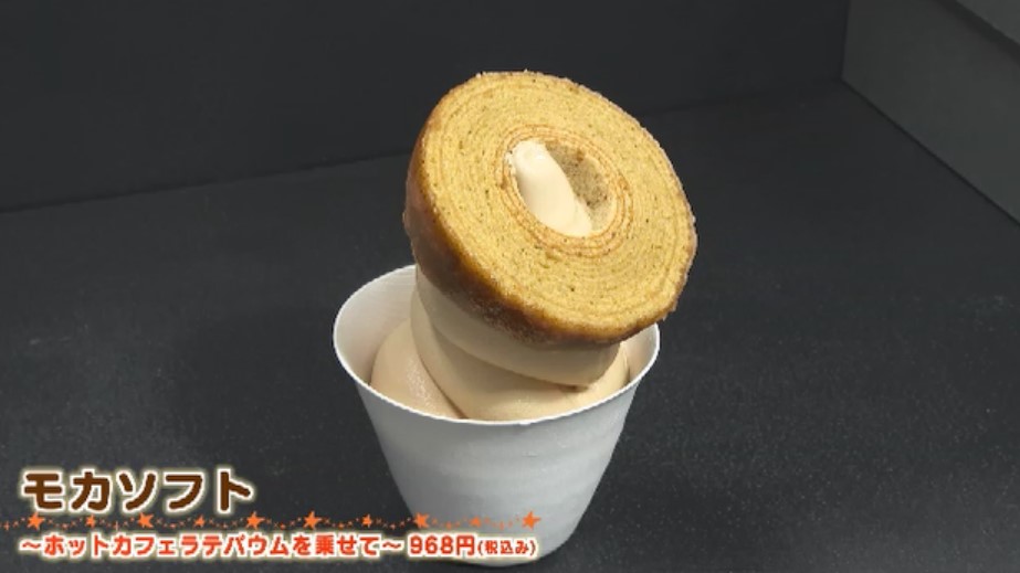 コーヒーのほろ苦さが味わえるソフトクリームにのせるのは、温めたカフェラテ味のバウムクーヘン。