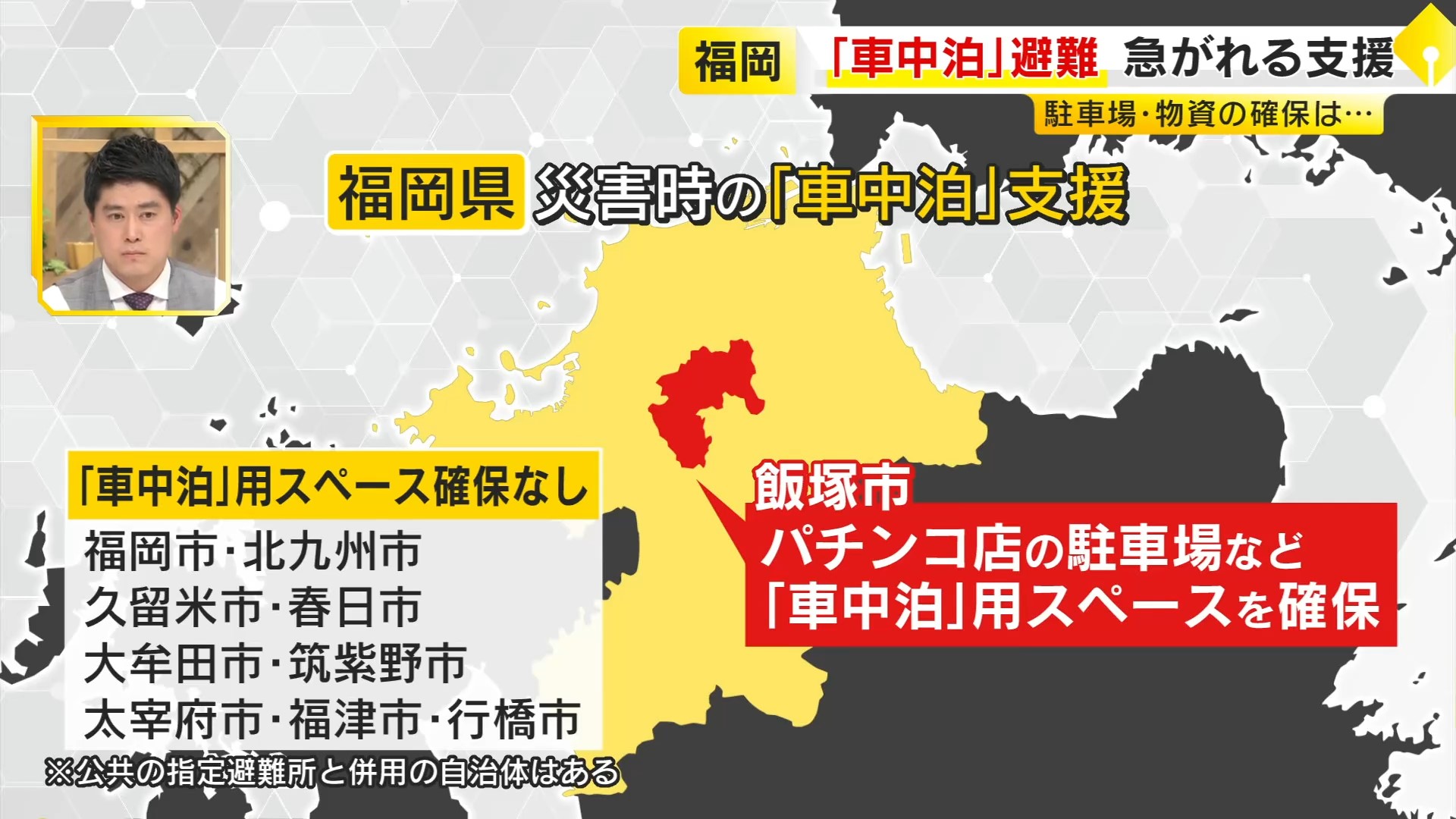 この中で、飯塚市に関してはパチンコ店の駐車場など民間とも提携して車中泊用の駐車スペースを確保している、ということです。