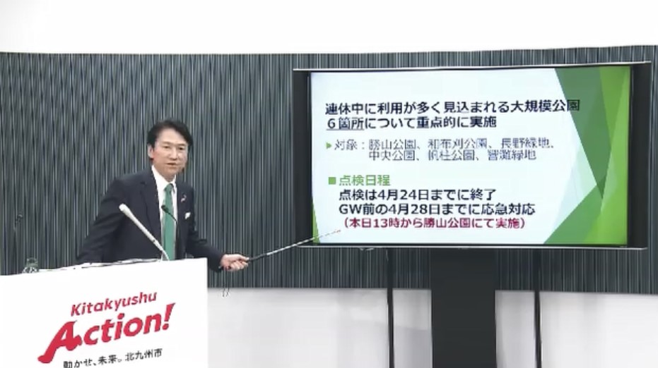 北九州市の武内市長は16日の定例会見で、子供の利用が増えるゴールデンウィークに向けて、勝山公園など市内6カ所の大規模な公園で樹木医による緊急点検を始めると発表しました。