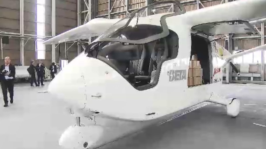 「こちらの電動航空機、500キロ以上の荷物を積んで飛ぶことができます」