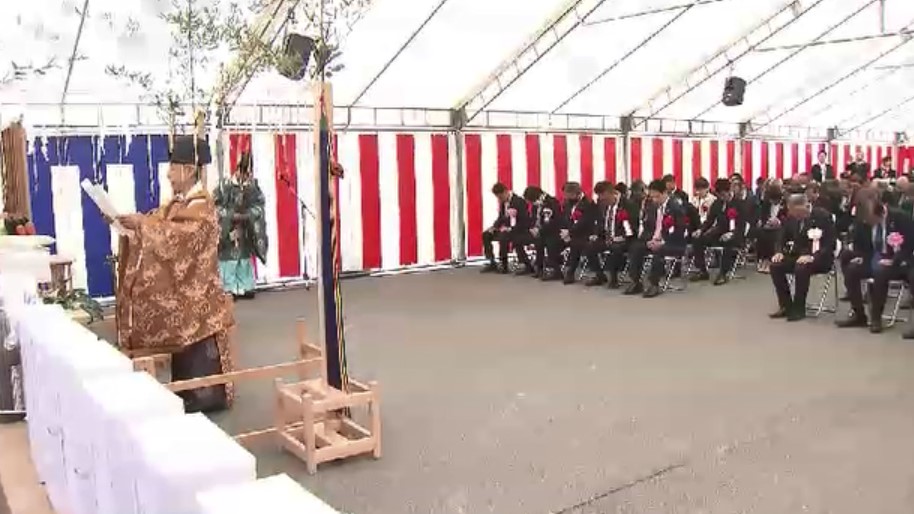 22日は「ひびきウインドエナジー」の三根社長らが出席して、発電所の安全を祈願する神事が行われた後、記念式典が開かれました。