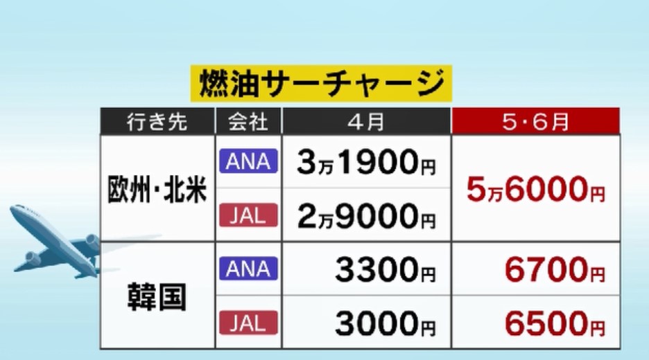 そんな中、全日空と日本航空は国際線の航空運賃に上乗せしている「燃油サーチャージ」を5月発券分から最大2倍程度引き上げると発表しました。