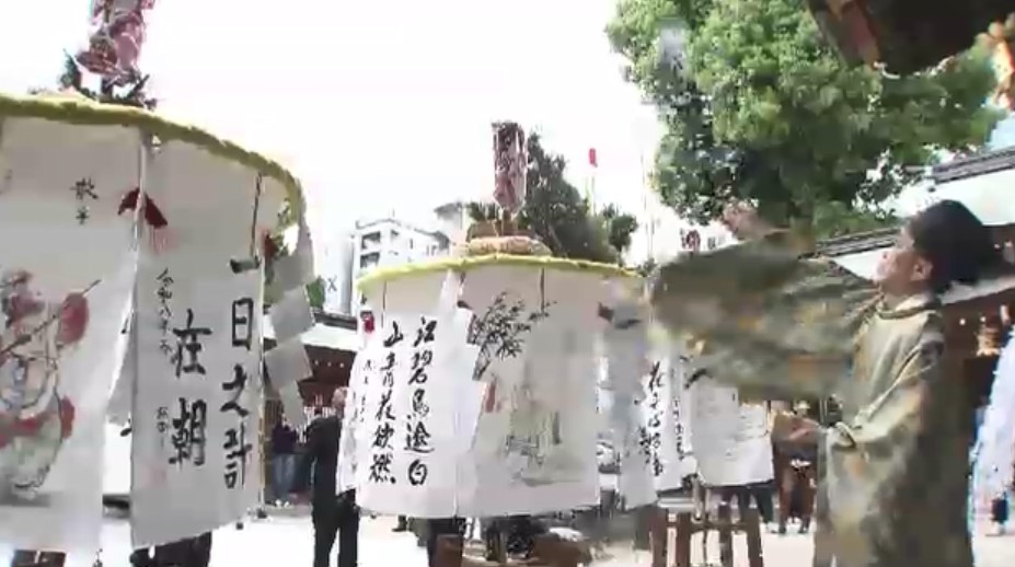 福岡市の櫛田神社で29日、「博多どんたく港まつり」初日のパレードを彩る傘鉾を清め払う神事「御神入れ」が行われ、博多松囃子振興会の関係者らが参加しました。